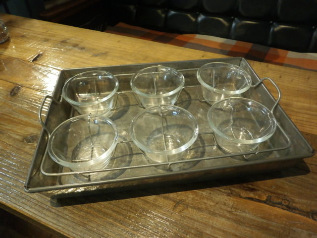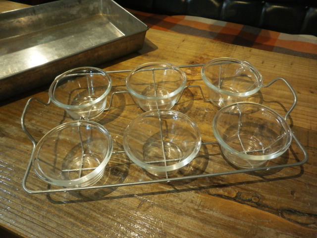 耐熱ガラスでお馴染みのパイレックスのカップセットに、ワイヤーラックとスチールトレーがセットになっています。