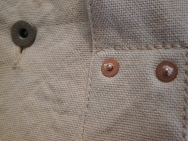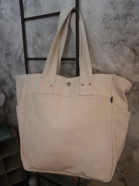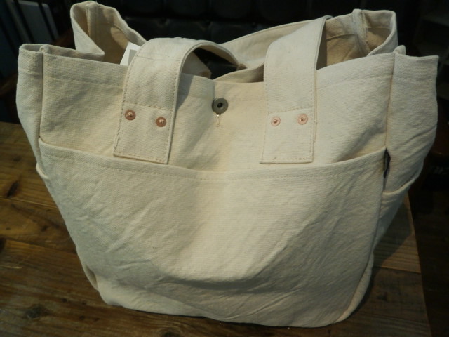 外側にも大きなポケットが付き、リベットやドーナツボタンが特徴のワークトートバッグ。